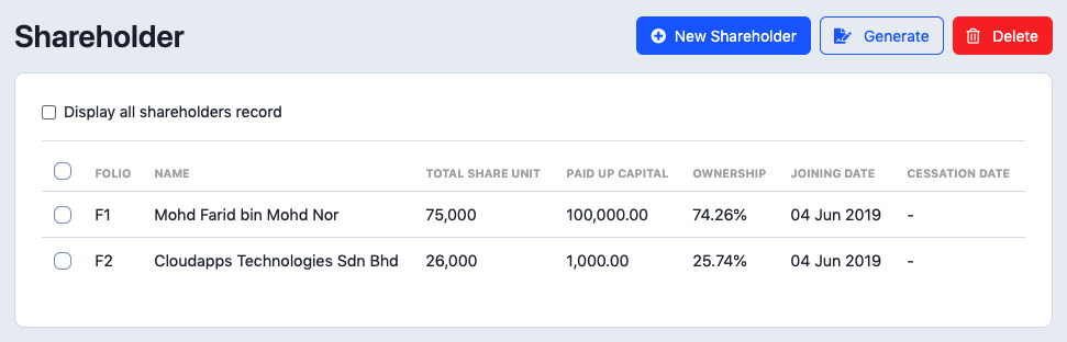 - Select the shareholder/member by ticking the checkbox.